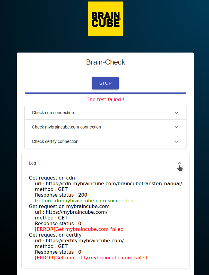 The purpose of Brain-check-front is to reach some Braincube API point in order to check that nothing keep a factory from accessing the cloud.