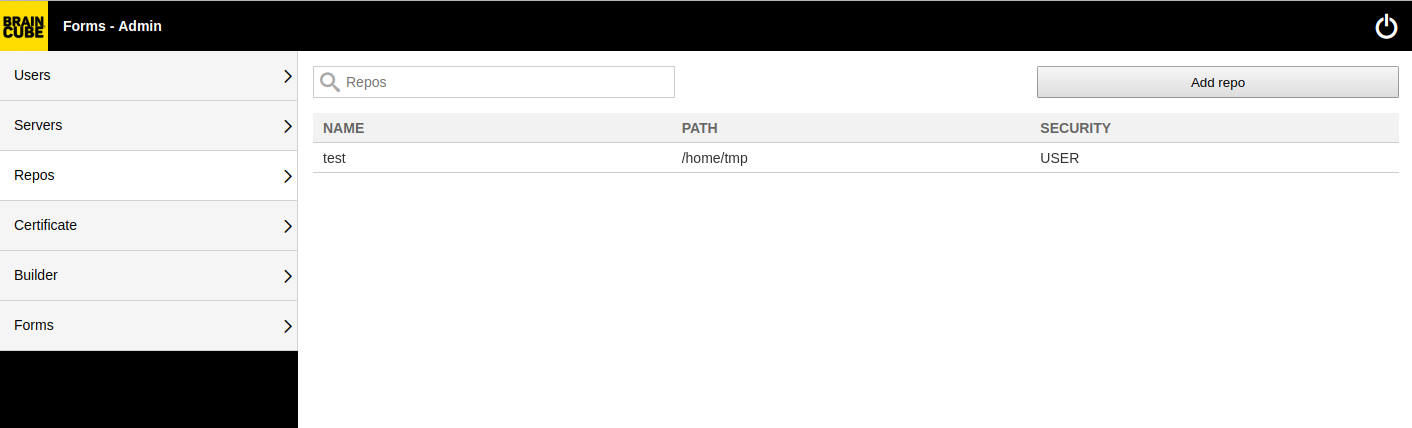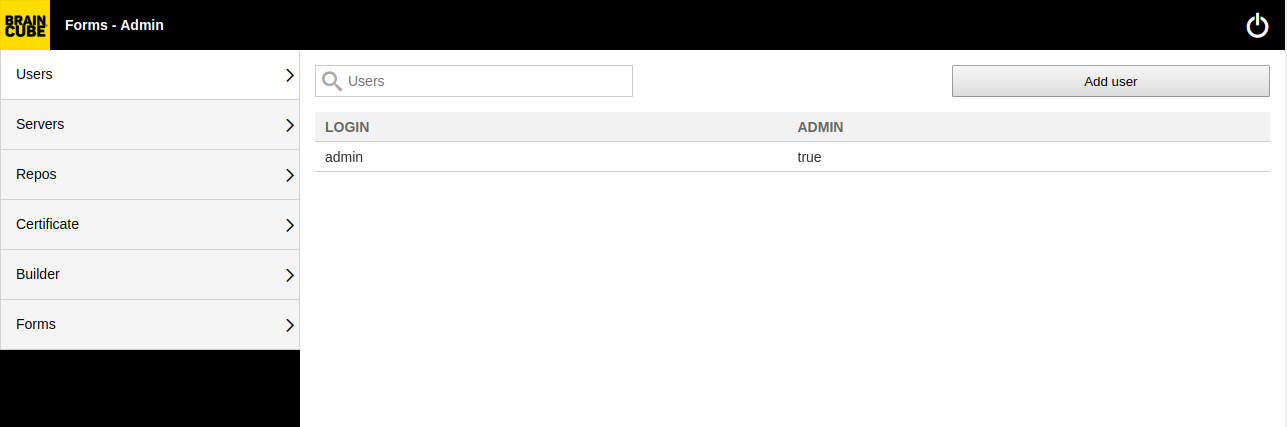 - Admin : access to administration interface with all the tabs (Users / Servers / Repos / Certificate / Builder / Forms)