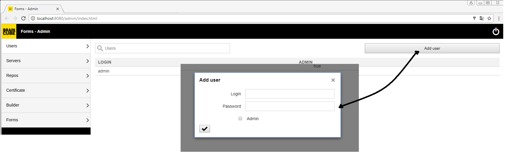 The Braincube Forms Server interface is the Form Admin. You can access it on your browser by typing on the address bar “IP:8080” with the Local IP of the computer where is installed the folder braincube-form.