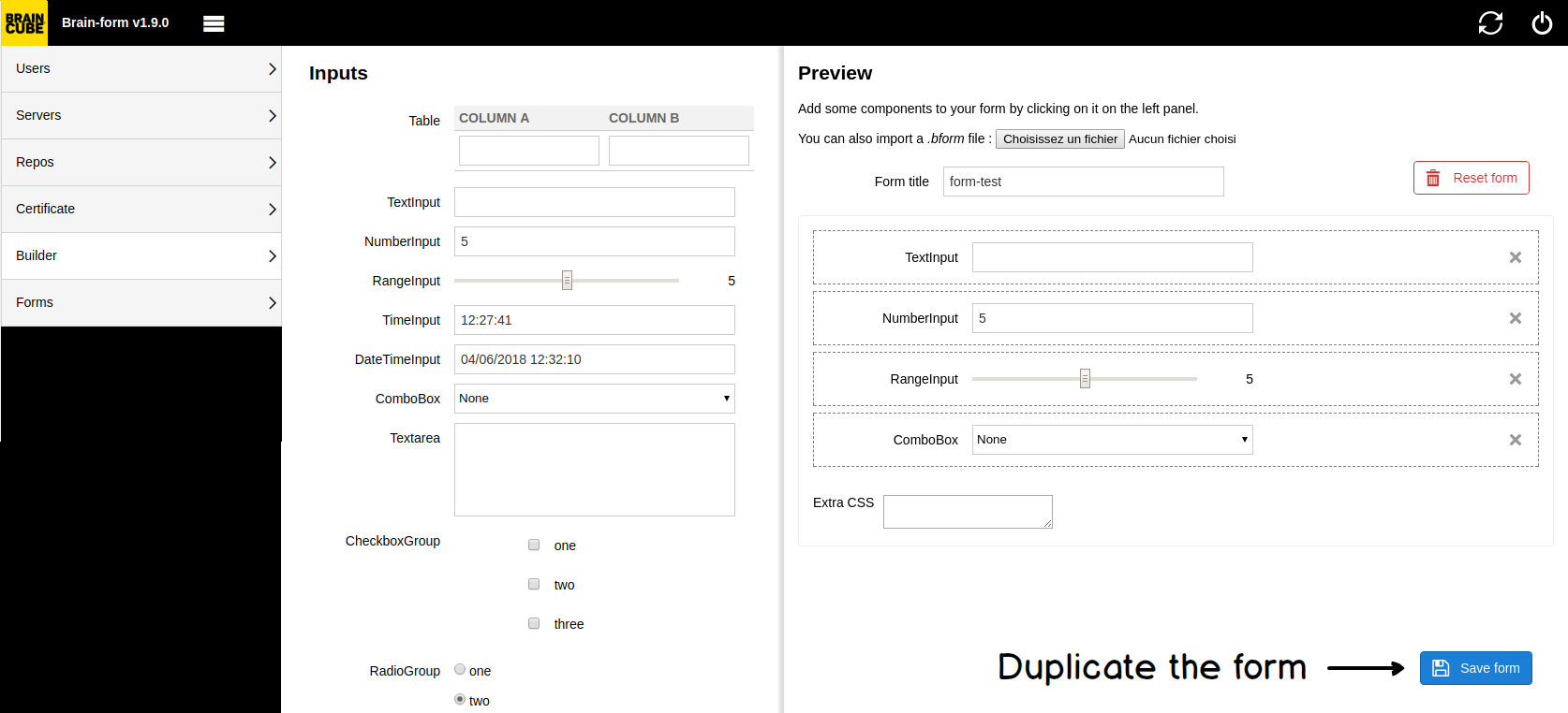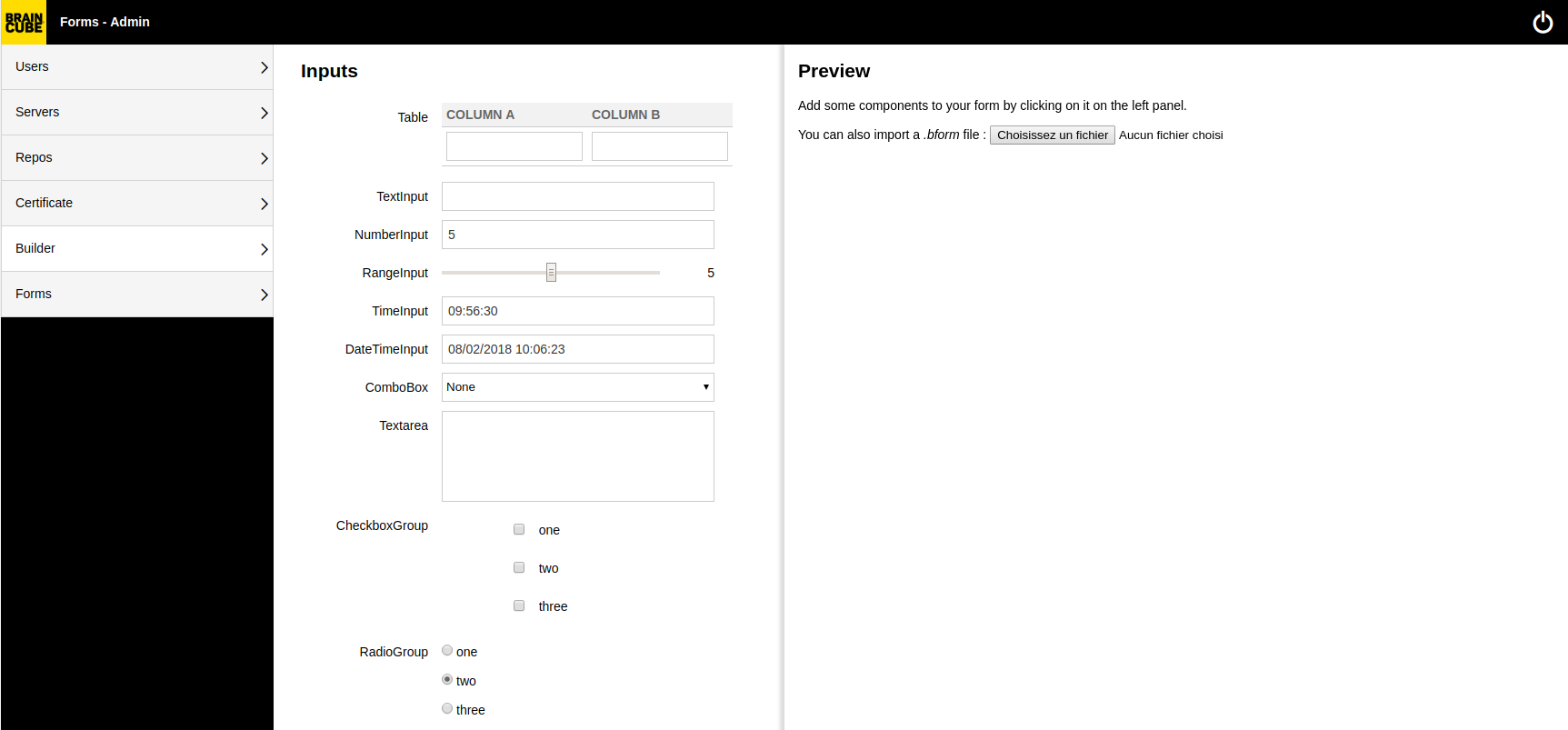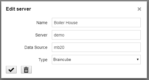 - SERVERS: create / modify / delete servers by specifying which Braincube is needed according to your data form