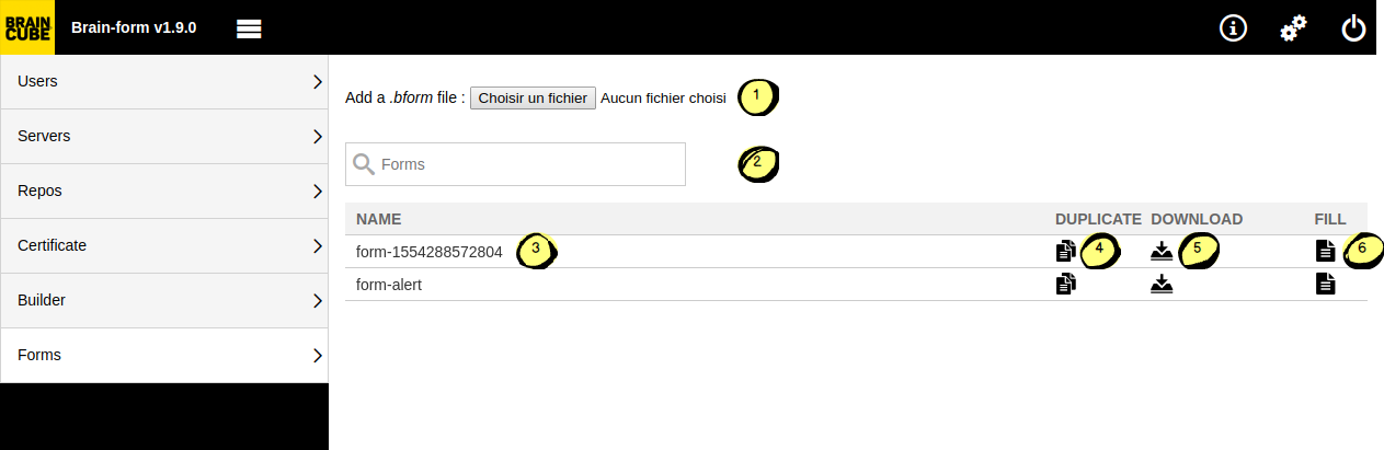 - FORMS : list / modify / delete the forms created and saved in the form folder, with a link to view them on the Form Viewer