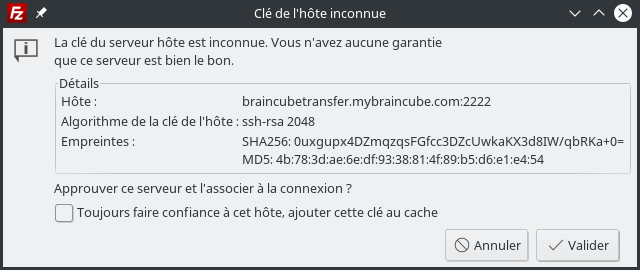 Using external tools for file transfering is intended for advanced users, and Braincube does not provide support for this.